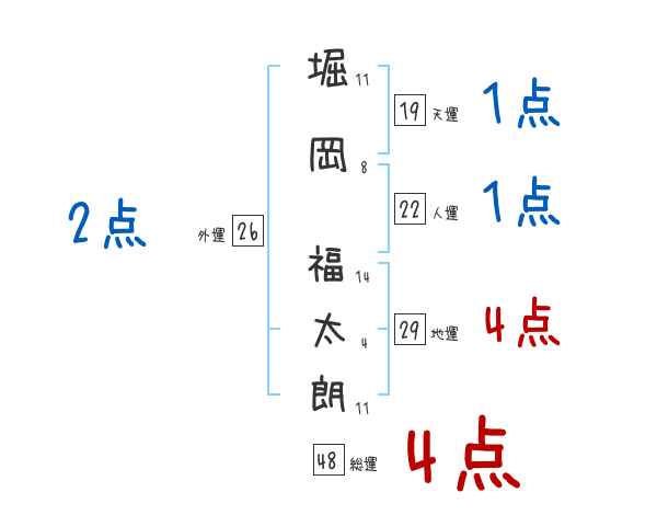 外運![]() | 堀岡福太朗さんの外運は26画の2つ星!波瀾万丈かも。信頼できる人を大事にしましょう。 生活面を象徴する運勢です。外部から受ける影響力を表し、結婚運、家庭運や職場、環境への順応性を表します。 |