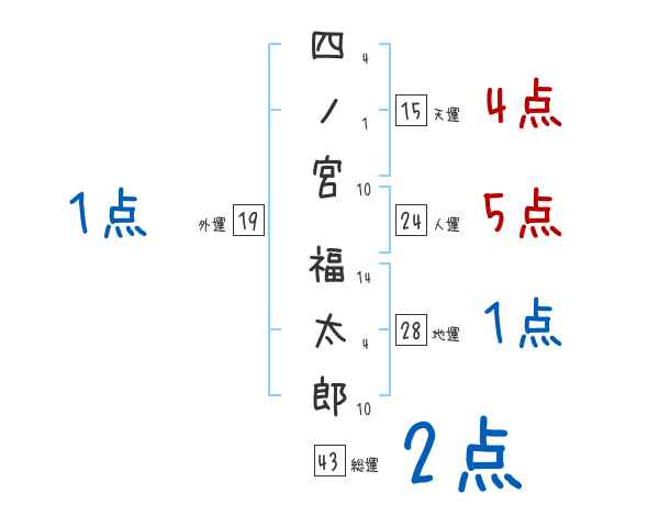 外運![]() | 四ノ宮福太郎さんの外運は19画の1つ星!優れた才能を持ちますが、協調性が足りないことも。周りの人と協力する事を意識しましょう。 生活面を象徴する運勢です。外部から受ける影響力を表し、結婚運、家庭運や職場、環境への順応性を表します。 |