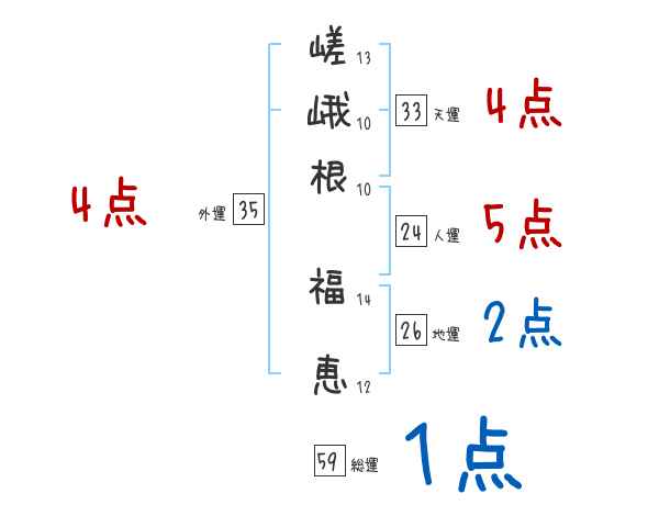 天運![]() | 嵯峨根福恵さんの天運は33画の4つ星!権力志向でプライドが高い。勇気があり運を切り開き成功する。 家系が持つ宿命的な運勢を表します。祖先から受け継いだ苗字ですので自分の力が及びません。家柄を象徴します。 |
