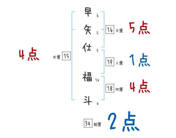 外運![]() | 早矢仕福斗さんの外運は15画の4つ星!人徳があり出世する。順調に物事を進め円満な人生。 生活面を象徴する運勢です。外部から受ける影響力を表し、結婚運、家庭運や職場、環境への順応性を表します。 |