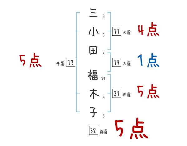 天運![]() | 三小田福木子さんの天運は11画の4つ星!着実に富や地位を得る幸運な人生。 家系が持つ宿命的な運勢を表します。祖先から受け継いだ苗字ですので自分の力が及びません。家柄を象徴します。 |
