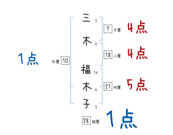 総運![]() | 三木福木子さんの総運は28画の1つ星!家庭環境に注意。スポーツで活躍できる能力があるかも。 あなたの人生を表す1番重要な運勢です。生涯を通じて影響する総合運となり、主に50歳以降の晩年期に影響を及ぼします。 |