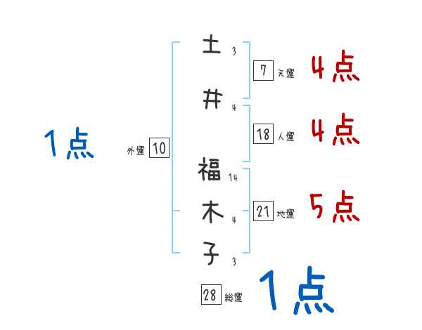 総運![]() | 土井福木子さんの総運は28画の1つ星!家庭環境に注意。スポーツで活躍できる能力があるかも。 あなたの人生を表す1番重要な運勢です。生涯を通じて影響する総合運となり、主に50歳以降の晩年期に影響を及ぼします。 |