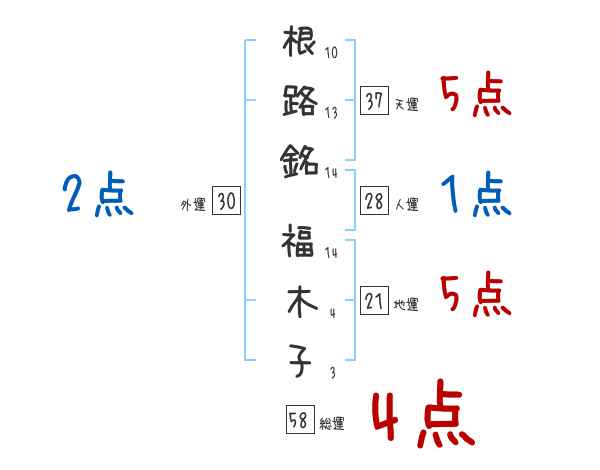 総運![]() | 根路銘福木子さんの総運は58画の4つ星!安定した生活。大器晩成タイプ。 あなたの人生を表す1番重要な運勢です。生涯を通じて影響する総合運となり、主に50歳以降の晩年期に影響を及ぼします。 |