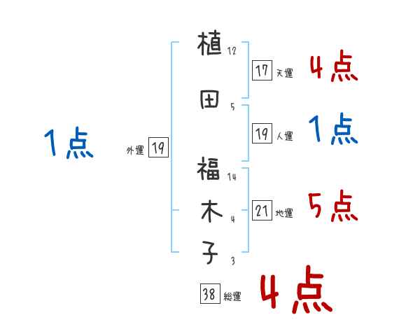 外運![]() | 植田福木子さんの外運は19画の1つ星!優れた才能を持ちますが、協調性が足りないことも。周りの人と協力する事を意識しましょう。 生活面を象徴する運勢です。外部から受ける影響力を表し、結婚運、家庭運や職場、環境への順応性を表します。 |