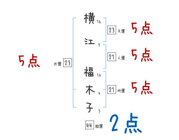 天運![]() | 横江福木子さんの天運は23画の5つ星!想像力に優れ活力がある。一代で成功し名誉を手に入れる。 家系が持つ宿命的な運勢を表します。祖先から受け継いだ苗字ですので自分の力が及びません。家柄を象徴します。 |