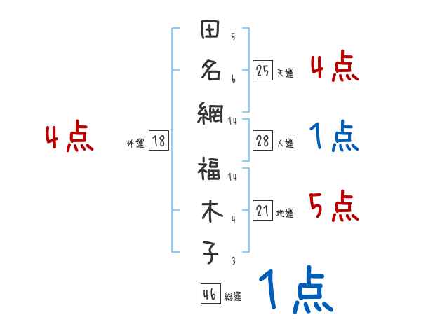 天運![]() | 田名網福木子さんの天運は25画の4つ星!個性があり才能があふれる。強運の持ち主で発展する。 家系が持つ宿命的な運勢を表します。祖先から受け継いだ苗字ですので自分の力が及びません。家柄を象徴します。 |
