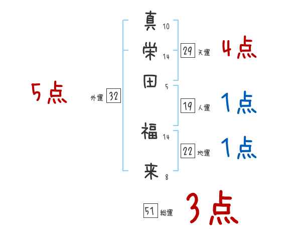 外運![]() | 真栄田福来さんの外運は32画の5つ星!柔軟性があり成功する。チャンスが多く金運が良い。 生活面を象徴する運勢です。外部から受ける影響力を表し、結婚運、家庭運や職場、環境への順応性を表します。 |