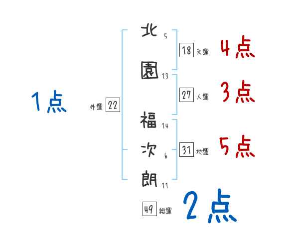 天運![]() | 北園福次朗さんの天運は18画の4つ星!情熱的で剛気。忍耐力があり信頼される。 家系が持つ宿命的な運勢を表します。祖先から受け継いだ苗字ですので自分の力が及びません。家柄を象徴します。 |