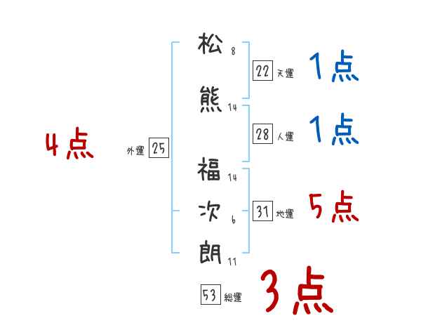 総運![]() | 松熊福次朗さんの総運は53画の3つ星!やや見栄っ張りで虚栄心がある。散財に注意。 あなたの人生を表す1番重要な運勢です。生涯を通じて影響する総合運となり、主に50歳以降の晩年期に影響を及ぼします。 |