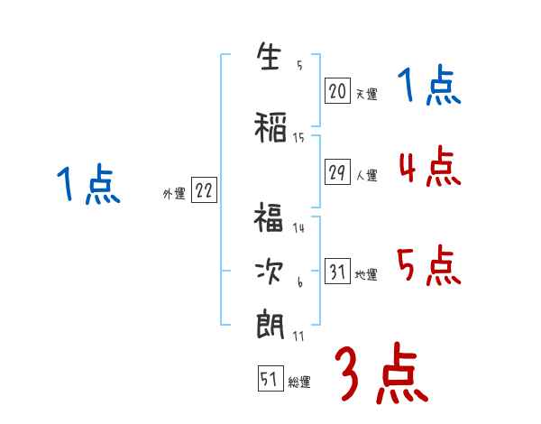 外運![]() | 生稲福次朗さんの外運は22画の1つ星!努力することが苦手ないっぽう手先が器用。芸術性にも優れる。 生活面を象徴する運勢です。外部から受ける影響力を表し、結婚運、家庭運や職場、環境への順応性を表します。 |