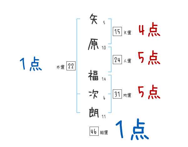 総運![]() | 矢原福次朗さんの総運は46画の1つ星!迷走することが多く苦労するかも。目先のことにとらわれないように。 あなたの人生を表す1番重要な運勢です。生涯を通じて影響する総合運となり、主に50歳以降の晩年期に影響を及ぼします。 |