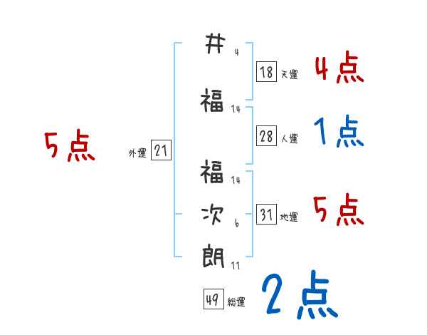 外運![]() | 井福福次朗さんの外運は21画の5つ星!統率力がある。独立し成功する。名誉を手に入れる。 生活面を象徴する運勢です。外部から受ける影響力を表し、結婚運、家庭運や職場、環境への順応性を表します。 |