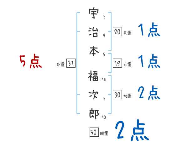 総運![]() | 宇治本福次郎さんの総運は50画の2つ星!浮き沈みが激しく不安定。しりすぼみに衰退しやすいので注意しましょう。 あなたの人生を表す1番重要な運勢です。生涯を通じて影響する総合運となり、主に50歳以降の晩年期に影響を及ぼします。 |