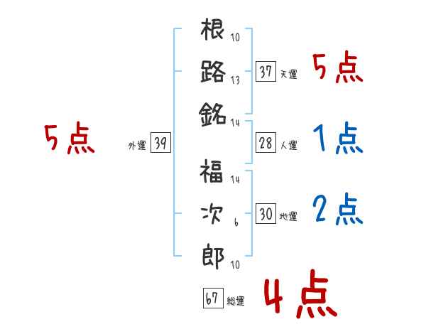 総運![]() | 根路銘福次郎さんの総運は67画の4つ星!幸運な人生。堅実な性格で調和し、周りの人に助けられる。 あなたの人生を表す1番重要な運勢です。生涯を通じて影響する総合運となり、主に50歳以降の晩年期に影響を及ぼします。 |