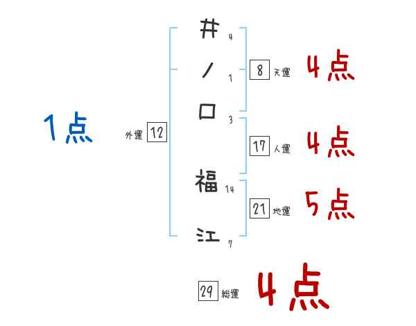 天運![]() | 井ノ口福江さんの天運は8画の4つ星!勤勉家。根気強く努力し成功する。忍耐力がある。 家系が持つ宿命的な運勢を表します。祖先から受け継いだ苗字ですので自分の力が及びません。家柄を象徴します。 |