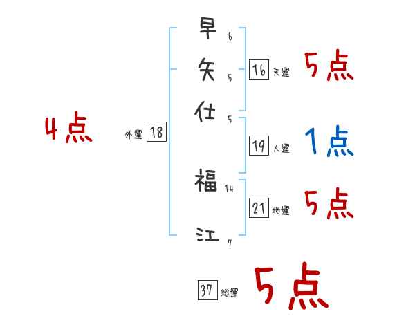 外運![]() | 早矢仕福江さんの外運は18画の4つ星!情熱的で剛気。忍耐力があり信頼される。 生活面を象徴する運勢です。外部から受ける影響力を表し、結婚運、家庭運や職場、環境への順応性を表します。 |
