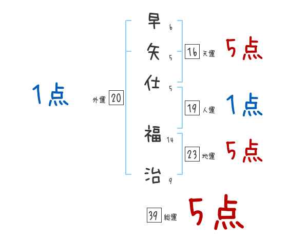 総運![]() | 早矢仕福治さんの総運は39画の5つ星!社交性に優れ人望が厚い。人の上に立ち成功する。 あなたの人生を表す1番重要な運勢です。生涯を通じて影響する総合運となり、主に50歳以降の晩年期に影響を及ぼします。 |