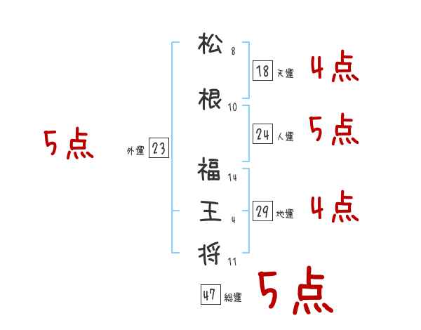 天運![]() | 松根福王将さんの天運は18画の4つ星!情熱的で剛気。忍耐力があり信頼される。 家系が持つ宿命的な運勢を表します。祖先から受け継いだ苗字ですので自分の力が及びません。家柄を象徴します。 |