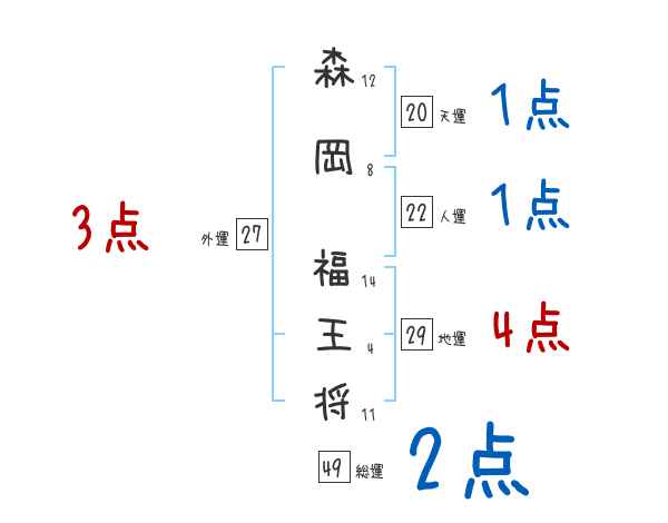 人運![]() | 森岡福王将さんの人運は22画の1つ星!努力することが苦手ないっぽう手先が器用。芸術性にも優れる。 性格や才能などを表す2番目に重要な運勢です。人間関係や協調性、社会的な成功に影響します。主に20歳から50歳ぐらいまでの中年期の運勢を表します。 |