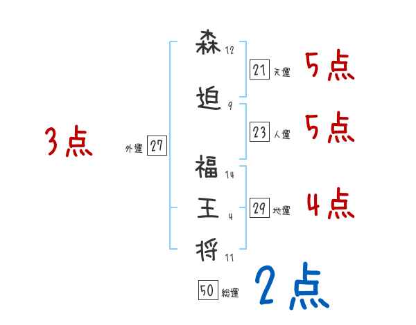 天運![]() | 森迫福王将さんの天運は21画の5つ星!統率力がある。独立し成功する。名誉を手に入れる。 家系が持つ宿命的な運勢を表します。祖先から受け継いだ苗字ですので自分の力が及びません。家柄を象徴します。 |