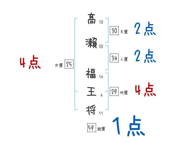 天運![]() | 髙瀨福王将さんの天運は30画の2つ星!浮き沈みの激しさに注意しましょう。 家系が持つ宿命的な運勢を表します。祖先から受け継いだ苗字ですので自分の力が及びません。家柄を象徴します。 |