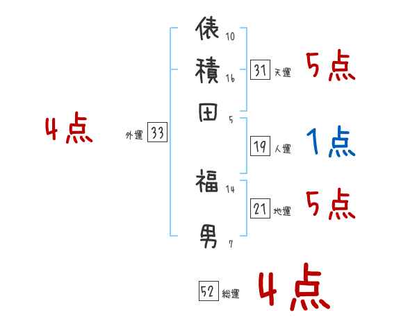 天運![]() | 俵積田福男さんの天運は31画の5つ星!社交性があり判断力に優れる。順風満帆な人生で円満な生活。 家系が持つ宿命的な運勢を表します。祖先から受け継いだ苗字ですので自分の力が及びません。家柄を象徴します。 |