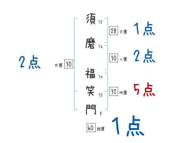 総運![]() | 須磨福笑門さんの総運は60画の1つ星!悲観的で迷いやすい。波乱が多く損をしないように。 あなたの人生を表す1番重要な運勢です。生涯を通じて影響する総合運となり、主に50歳以降の晩年期に影響を及ぼします。 |