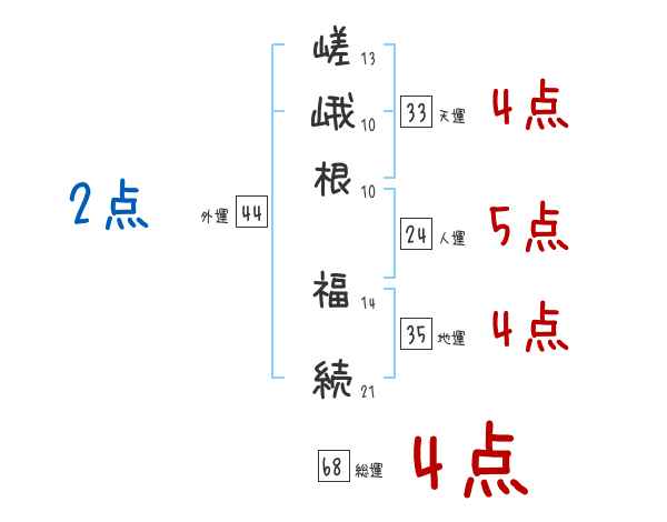 天運![]() | 嵯峨根福続さんの天運は33画の4つ星!権力志向でプライドが高い。勇気があり運を切り開き成功する。 家系が持つ宿命的な運勢を表します。祖先から受け継いだ苗字ですので自分の力が及びません。家柄を象徴します。 |