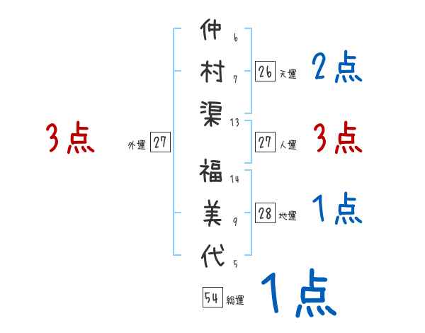 人運![]() | 仲村渠福美代さんの人運は27画の3つ星!頭脳明晰だが強情で摩擦が多い傾向。孤立に注意。 性格や才能などを表す2番目に重要な運勢です。人間関係や協調性、社会的な成功に影響します。主に20歳から50歳ぐらいまでの中年期の運勢を表します。 |