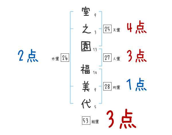 外運![]() | 室之園福美代さんの外運は26画の2つ星!波瀾万丈かも。信頼できる人を大事にしましょう。 生活面を象徴する運勢です。外部から受ける影響力を表し、結婚運、家庭運や職場、環境への順応性を表します。 |