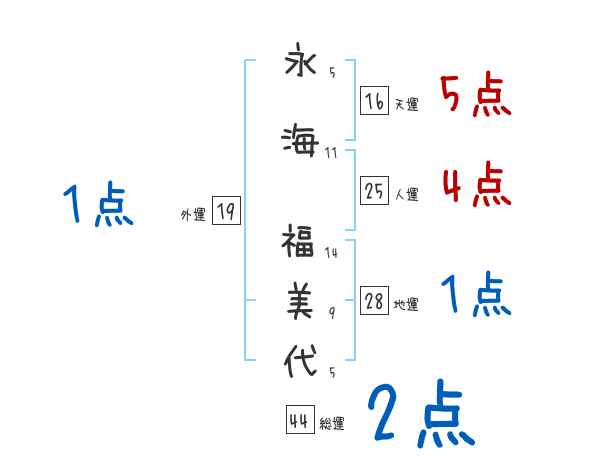 天運![]() | 永海福美代さんの天運は16画の5つ星!人望が厚く大きく発展する。逆転成功が見える。 家系が持つ宿命的な運勢を表します。祖先から受け継いだ苗字ですので自分の力が及びません。家柄を象徴します。 |