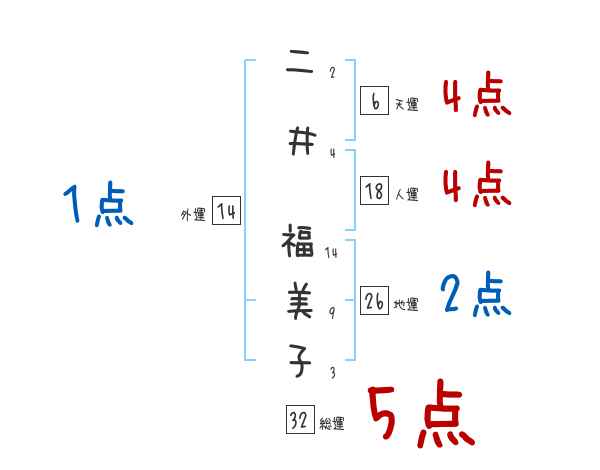 外運![]() | 二井福美子さんの外運は14画の1つ星!人に対して優しいがストレスを溜め込みがち。人間関係のトラブルを避けるよう気をつけましょう。 生活面を象徴する運勢です。外部から受ける影響力を表し、結婚運、家庭運や職場、環境への順応性を表します。 |