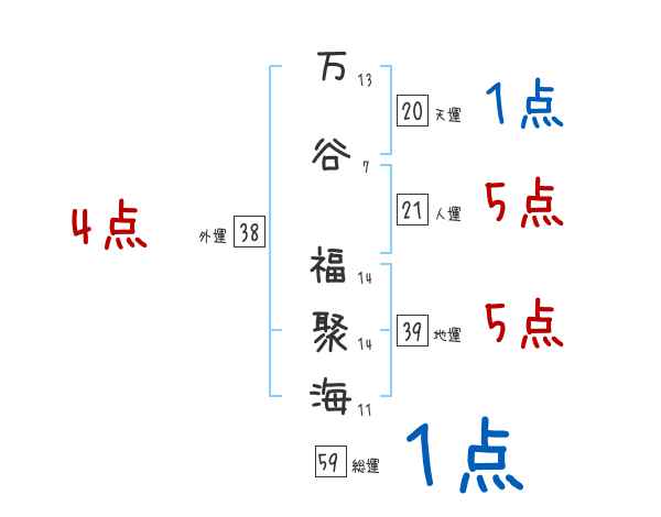 地運![]() | 万谷福聚海さんの地運は39画の5つ星!社交性に優れ人望が厚い。人の上に立ち成功する。 個性を表す基礎的な運勢です。性格形成や対人関係、行動力など家庭環境に影響されます。主に誕生してから20歳くらいまでの若年期の運勢を表します。 |