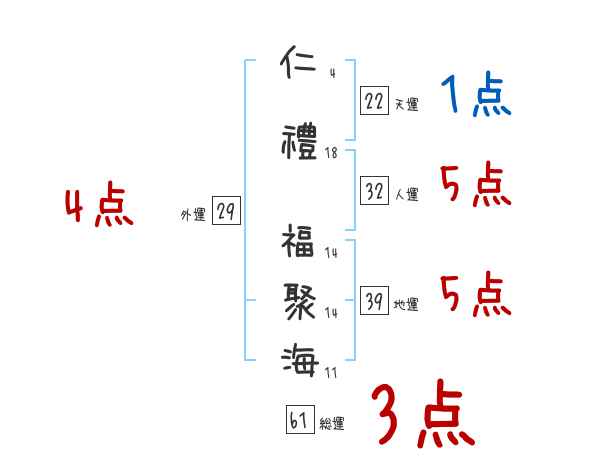 人運![]() | 仁禮福聚海さんの人運は32画の5つ星!柔軟性があり成功する。チャンスが多く金運が良い。 性格や才能などを表す2番目に重要な運勢です。人間関係や協調性、社会的な成功に影響します。主に20歳から50歳ぐらいまでの中年期の運勢を表します。 |