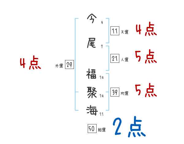 外運![]() | 今尾福聚海さんの外運は29画の4つ星!完全主義で才能がある。厳格な心の持ち主。 生活面を象徴する運勢です。外部から受ける影響力を表し、結婚運、家庭運や職場、環境への順応性を表します。 |