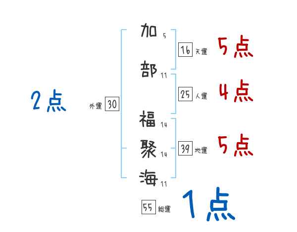 天運![]() | 加部福聚海さんの天運は16画の5つ星!人望が厚く大きく発展する。逆転成功が見える。 家系が持つ宿命的な運勢を表します。祖先から受け継いだ苗字ですので自分の力が及びません。家柄を象徴します。 |