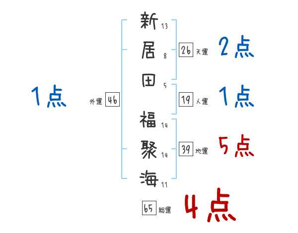 外運![]() | 新居田福聚海さんの外運は46画の1つ星!迷走することが多く苦労するかも。目先のことにとらわれないように。 生活面を象徴する運勢です。外部から受ける影響力を表し、結婚運、家庭運や職場、環境への順応性を表します。 |
