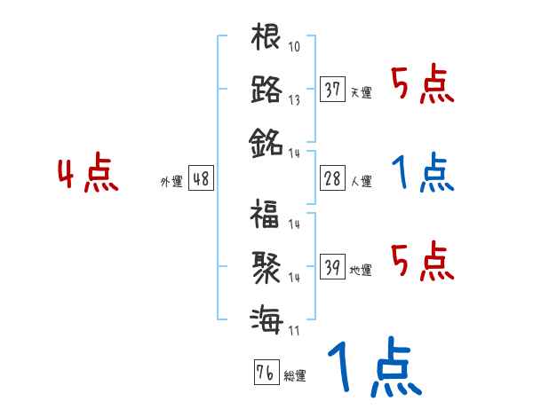 地運![]() | 根路銘福聚海さんの地運は39画の5つ星!社交性に優れ人望が厚い。人の上に立ち成功する。 個性を表す基礎的な運勢です。性格形成や対人関係、行動力など家庭環境に影響されます。主に誕生してから20歳くらいまでの若年期の運勢を表します。 |