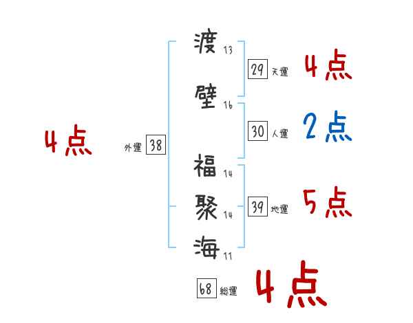 外運![]() | 渡壁福聚海さんの外運は38画の4つ星!温厚な性格で技術的な才能を発揮する。職人的な仕事に向いている。 生活面を象徴する運勢です。外部から受ける影響力を表し、結婚運、家庭運や職場、環境への順応性を表します。 |