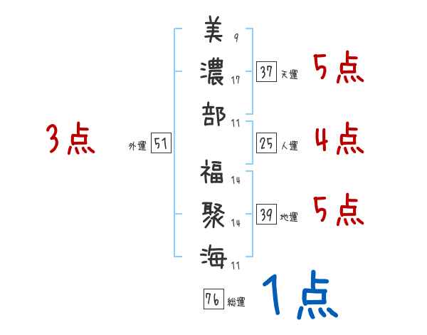 外運![]() | 美濃部福聚海さんの外運は51画の3つ星!変化が激しく、危険に注意。堅実な性格。 生活面を象徴する運勢です。外部から受ける影響力を表し、結婚運、家庭運や職場、環境への順応性を表します。 |