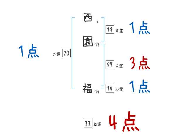 総運![]() | 西園福さんの総運は33画の4つ星!権力志向でプライドが高い。勇気があり運を切り開き成功する。 あなたの人生を表す1番重要な運勢です。生涯を通じて影響する総合運となり、主に50歳以降の晩年期に影響を及ぼします。 |