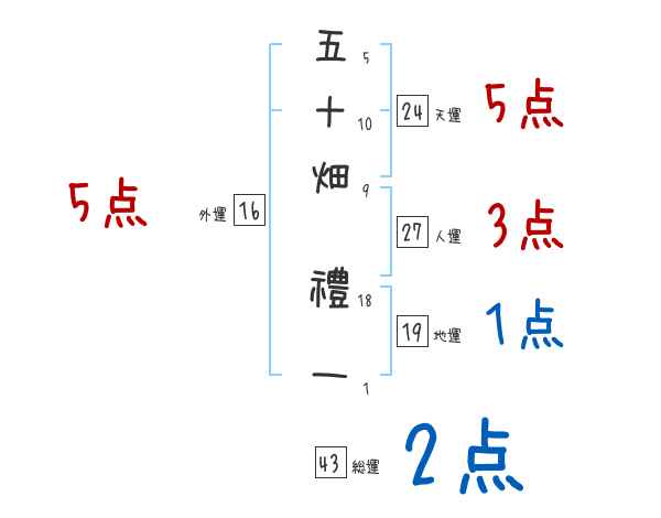 外運![]() | 五十畑禮一さんの外運は16画の5つ星!人望が厚く大きく発展する。逆転成功が見える。 生活面を象徴する運勢です。外部から受ける影響力を表し、結婚運、家庭運や職場、環境への順応性を表します。 |