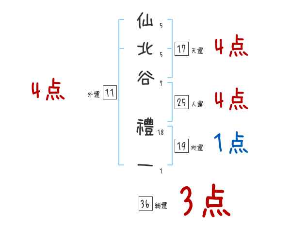 天運![]() | 仙北谷禮一さんの天運は17画の4つ星!積極的な行動力。地位を気づき財産を手に入れる。純粋な心と直感力。 家系が持つ宿命的な運勢を表します。祖先から受け継いだ苗字ですので自分の力が及びません。家柄を象徴します。 |