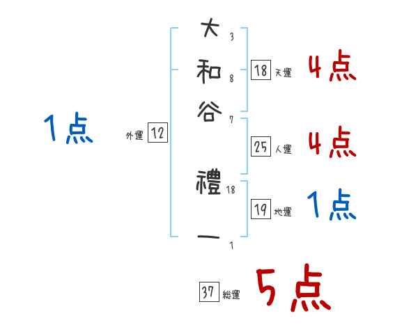 天運![]() | 大和谷禮一さんの天運は18画の4つ星!情熱的で剛気。忍耐力があり信頼される。 家系が持つ宿命的な運勢を表します。祖先から受け継いだ苗字ですので自分の力が及びません。家柄を象徴します。 |