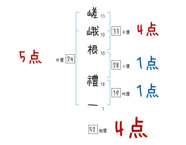 天運![]() | 嵯峨根禮一さんの天運は33画の4つ星!権力志向でプライドが高い。勇気があり運を切り開き成功する。 家系が持つ宿命的な運勢を表します。祖先から受け継いだ苗字ですので自分の力が及びません。家柄を象徴します。 |