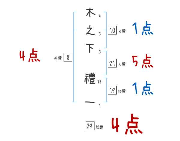 総運![]() | 木之下禮一さんの総運は29画の4つ星!完全主義で才能がある。厳格な心の持ち主。 あなたの人生を表す1番重要な運勢です。生涯を通じて影響する総合運となり、主に50歳以降の晩年期に影響を及ぼします。 |