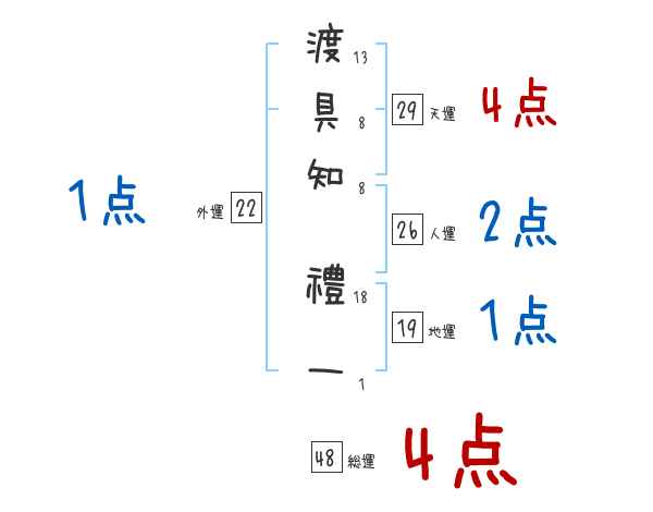 外運![]() | 渡具知禮一さんの外運は22画の1つ星!努力することが苦手ないっぽう手先が器用。芸術性にも優れる。 生活面を象徴する運勢です。外部から受ける影響力を表し、結婚運、家庭運や職場、環境への順応性を表します。 |