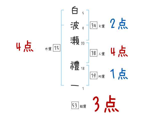 総運![]() | 白波瀬禮一さんの総運は53画の3つ星!やや見栄っ張りで虚栄心がある。散財に注意。 あなたの人生を表す1番重要な運勢です。生涯を通じて影響する総合運となり、主に50歳以降の晩年期に影響を及ぼします。 |