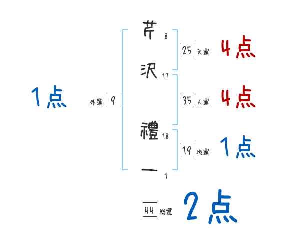 総運![]() | 芹沢禮一さんの総運は44画の2つ星!誠実で慎重な性格。物事を考えすぎないように注意しましょう。 あなたの人生を表す1番重要な運勢です。生涯を通じて影響する総合運となり、主に50歳以降の晩年期に影響を及ぼします。 |